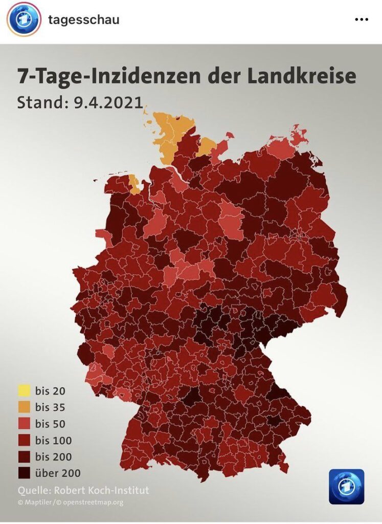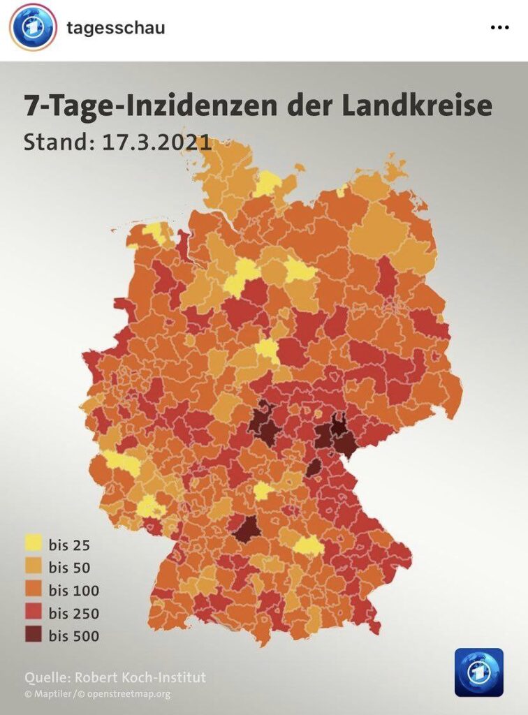 Eine bodenlose Manipulation der Fernsehzuschauer durch Wechsel der Zahlen und Farben bei den „Inzidenzen“von Angelika10. April 202110. April 2021 Man beachte die Zahlen am 17.3.21: bis 25/ 50/ 100/ 250 / 500 Und hier die veränderten Zahlen am 9.4.21: bis 20/ 35/ 50/ 100 / bis 200 / über 200 mit der entsprechenden EinfärbungSo viel Bösartigkeit macht einfach fassungslos!