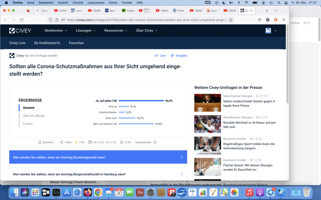 „Reitschuster“ berichtet schockiert: „Das Ergebnis einer Umfrage des Meinungsforschungsinstituts YouGov im Auftrag der Deutschen Presse-Agentur lautet dagegen, dass fast zwei Drittel (64 Prozent) der Deutschen sagen, die Pandemie sei für sie noch nicht vorbei. Eine Mehrheit ist der Umfrage zufolge gegen ein bundesweites Ende der Maskenpflicht in öffentlichen Verkehrsmitteln (52 Prozent) und gegen eine Abschaffung der Isolationspflicht für Infizierte (60 Prozent). Dass die Pandemie für sie bereits Geschichte sei, gaben sage und schreibe nur 31 Prozent an. 23 Prozent sind der Auffassung, dass sie erst 2023 zu Ende gehen wird. Mehr noch: 41 Prozent gehen davon aus, dass sie noch das ganze nächste Jahr anhalten wird.“