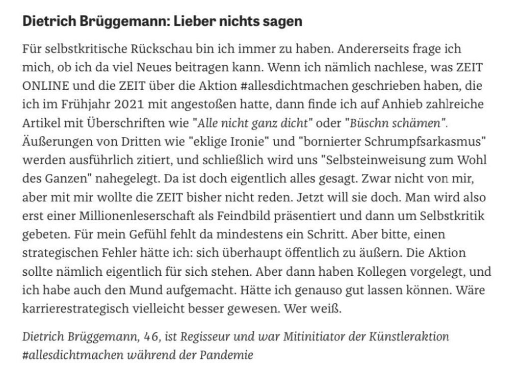 2021 erklärt die „ZEIT“ Dietrich Brüggemann zum Feind