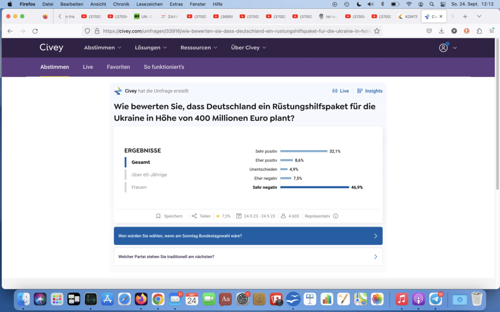 54,4% bewerten weitere Rüstungshilfe für die Ukraine negativ, 40,7% positivvon Angelika24. September 202324. September 2023