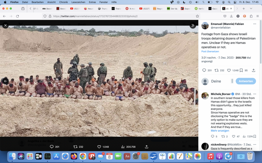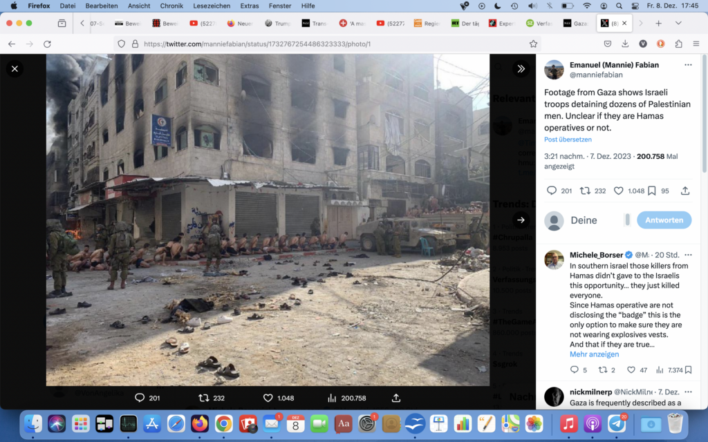 Ein Video und weitere Fotos zeigen eine andere Gruppe von mehr als hundert Männern verschiedenen Alters, die unter der Aufsicht von bewaffneten Soldaten ebenfalls fast völlig entkleidet in Reihen auf einer Strasse im Gazastreifen knien.“