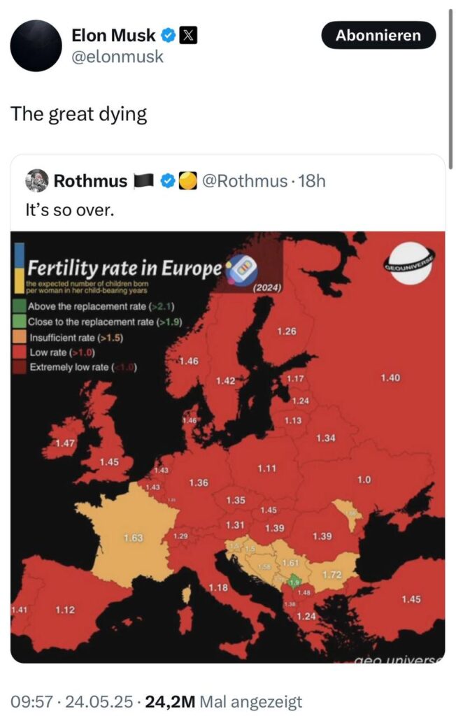 Kein Staat erfüllt die Rate von 2,1 Kindern pro Paar, die für den Erhalt der europäischen Bevölkerung benötigt werden. 30 Staaten, inclusive Russland und die Türkei, haben die zweitniedrigste Rate größer als 1 Kind, Spanien und 5 Balkanstaaten haben eine für die Reproduktion immer noch unzureichende Rate von größer als 1,5 Kinder.
