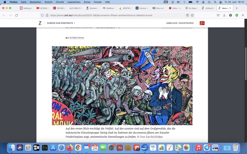 „Diese documenta stehe im Zeichen der Kollektivität, der Einbindung aller, des Miteinanders. Nachdem das indonesische Künstlerkollektiv ruangrupa die künstlerische Leitung übernommen hatte, sollten „kollektive Praktiken des Teilens“ zum bestimmenden Prinzip werden. Das klang inkludierend, für eine documenta geradezu revolutionär gleichberechtigt – und entsprechend groß waren die Erwartungen an eine Schau, die mit westlich-hegemonialen Sicht- und Ausstellungsweisen brechen wollte.“