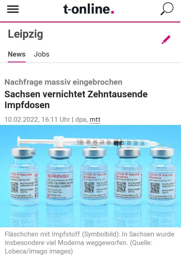 Die Zahl der Impfwilligen ist in Sachsen im Januar eingebrochen, kaum jemand möchte sich noch diesem medizinischen Experiment aussetzen. Auch bei der Booser-Quote ist Sachsen bundesweites Schlußlicht des Impfrankings. Und das hat Folgen: Mindestens 40.000 Impfdosen mussten entsorgt werden. Offenbar zeigen die Massenproteste Wirkung: Immer mehr Menschen setzen sich mit der Frage auseinander, ob sie sich überhaupt impfen lassen sollen. Und sehen, dass es viele Bürger gibt, die diesen Wahnsinn nicht mitmachen. Sehr schön! Auch wenn es unsere hart erarbeiteten Steuergelder sind!